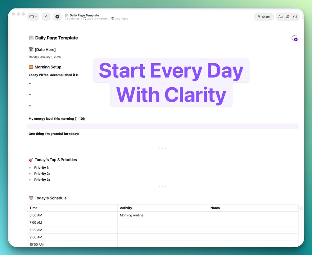 - Daily Page Template with morning setup + evening reflection