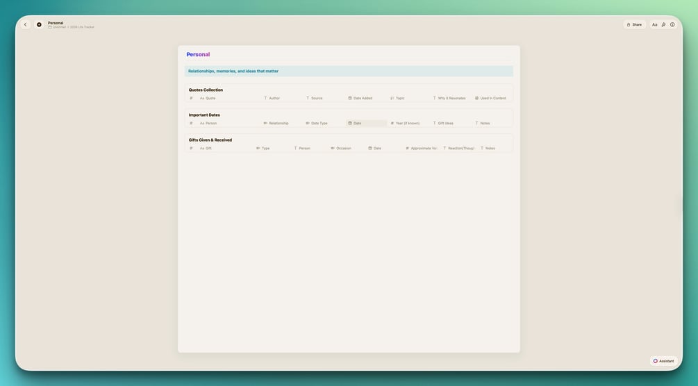 Your year-end reviews write themselves. Imagine ending December with complete data on every book you read, every place you visited, every dollar you earned and spent. Annual reflection becomes insight-rich instead of memory-dependent.
