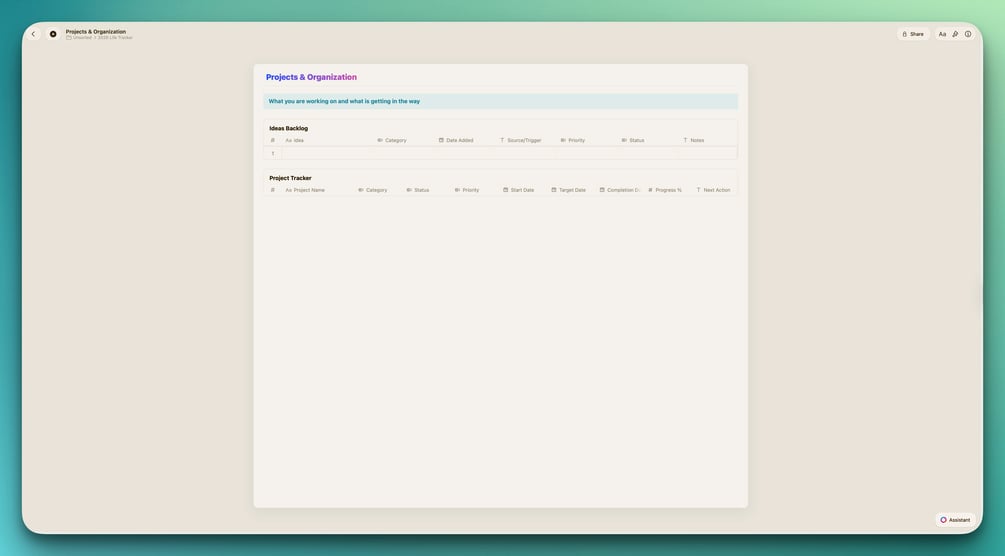 Project Tracker: Every project with status, priority, progress percentage, next action, and blockers. Stop letting projects fall through the cracks.