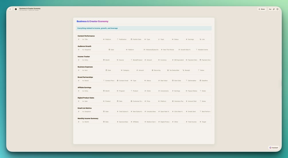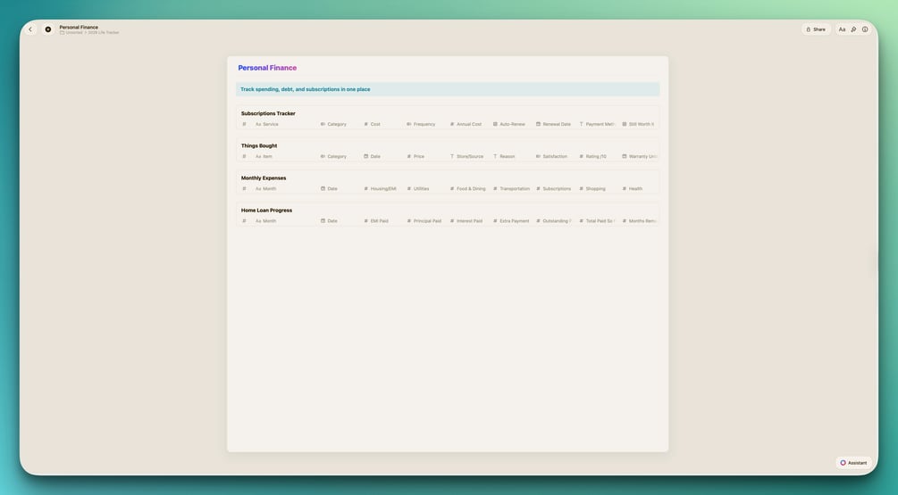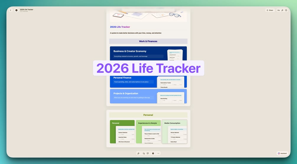 27 ready-to-use collections to track your income, expenses, content performance, books, movies, purchases, projects, and everything else that matters. Stop losing track of your life. Start seeing patterns.